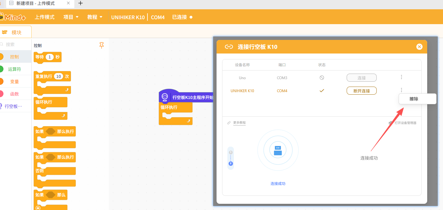 或在Mind+ V2上传模式中选中K10,然后连接K10,点击"擦除"