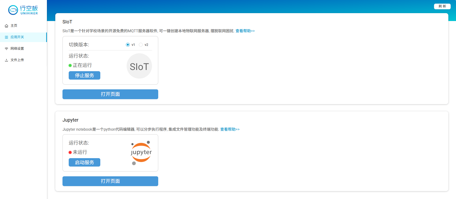 此页面显示SIoT和Jupyter这种具有后台管理页面的应用程序的运行状态,可以开关服务,点击打开页面可以一键跳转到对应服务管理页面。